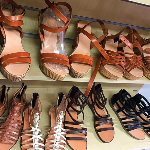 Not only are strappy sandals sold here, but wedges are also a great option. Many sandal styles and colors of a leather shop in Oia.